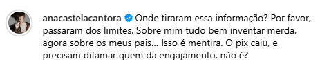 Ana rebateu os jornalistas e disse que a informação sobre os pais não aprovarem seu namoro era falsa. "Sobre mim tudo bem inventar merda, agora sobre os meus pais... Isso é mentira".