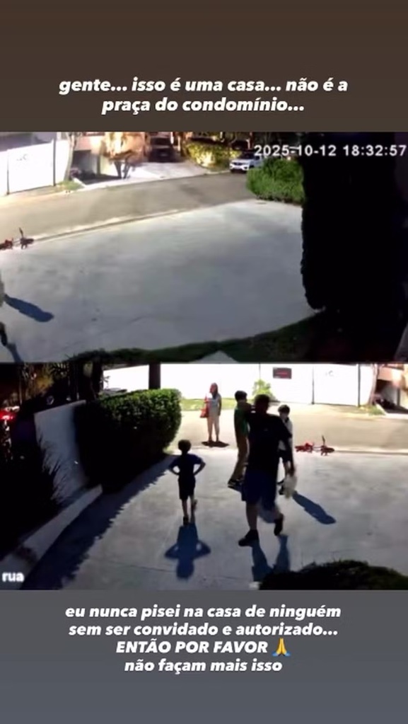 "Isso foi só ontem. Vocês acham que é brincadeira... mas isso não tem nenhuma graça e é errado. Estou gravando tudo, porque estou achando bem sem noção. Gente, isso é uma casa, não é a praça do condomínio... eu nunca pisei na casa de ninguém sem ser convidado e autorizado... então, por favor, não façam mais isso", complementou o ator.