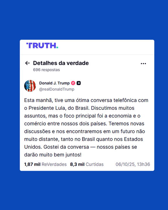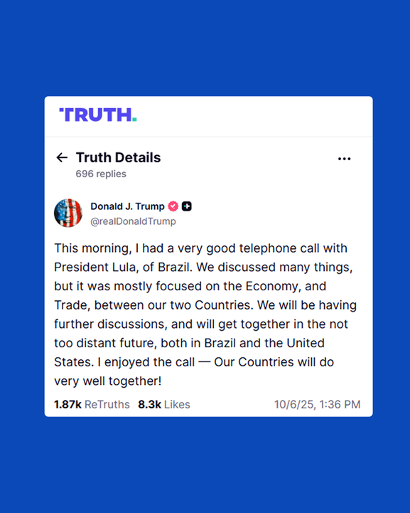“Esta manhã, tive uma ótima conversa telefônica com o presidente Lula, do Brasil. Discutimos muitos assuntos, mas o foco principal [abrange] a economia e o comércio entre nossos dois países. Teremos novas discussões e nos encontraremos em um futuro não muito distante, tanto no Brasil quanto nos Estados Unidos. Gostei da conversa — nossos países se darão muito bem juntos!”, afirmou Trump.